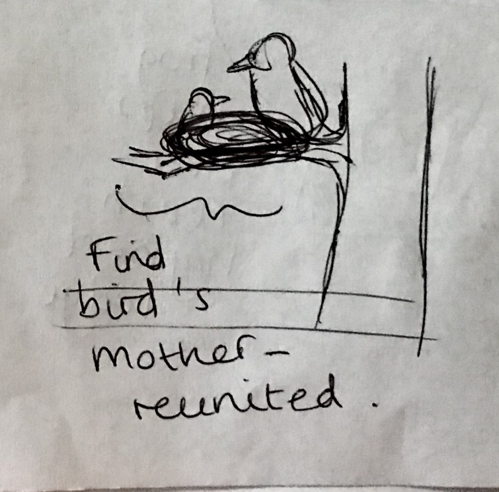 The player finds a baby bird – it is lying near a broken branch with a ruined nest on it – the player must return it to its mother