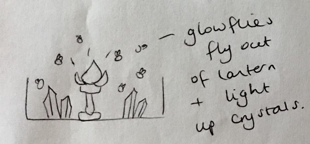 The player must then pick it up and place it in the cave – glow flies will come out from the lotus lantern and enter the crystals – an animation sequence of the crystals lighting up will ensue