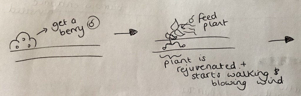 The player must find the wind plant – the plant is withering – it is seen weakly eating a berry
