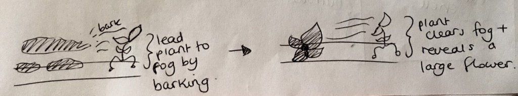 The plant will then begin blowing wind and uproot itself – it begins walking – the player must bark to lead it to the fog