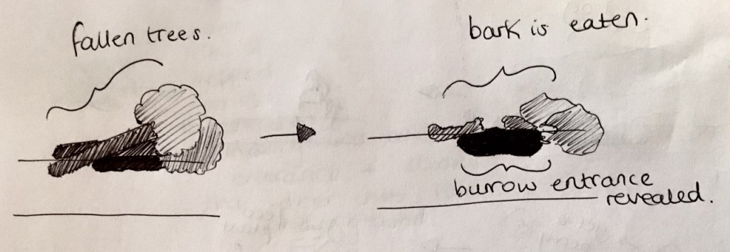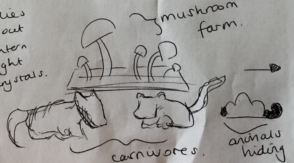 The player finds a mushroom farm that’s been taken over by carnivores that have mutated to eat mushrooms – there are smaller, hungry animals cowering nearby – one of them runs down a hole