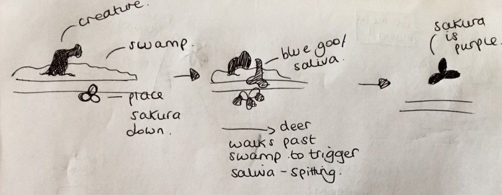 The player must travel to the swamp and place the sakura near it – when the player walks past the swamp, a creature will spit blue saliva onto the sakura – the player can then pick the flower up