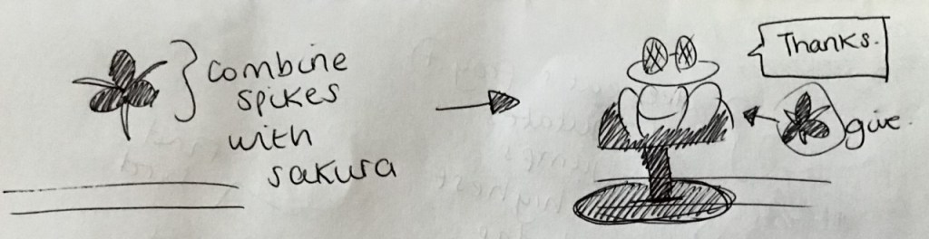 The player must go to the waterfall to get three eroded sticks – they can then replace the spikes with the sticks to obtain the spikes – the player can then attach the spikes to the sakura