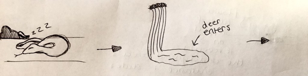 A skunk is hiding nearby – the player must scare the skunk so that its smell can lure the snake away from the path