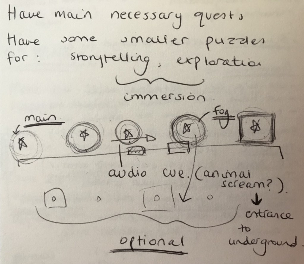 Next, we discussed how many smaller quests there should be and what one would obtain from doing them. We decided upon having four smaller quests as it would make the total amount of quests nine – enough to make the gameplay feel saturated without overloading the game with quests. Written below are the details for how the four smaller quests came to be and what they are. In regards to what the player gains from completing these quests, we discussed making the rewards non-materialistic as the main quests already offered many items. We couldn’t make the optional quests give items that were necessary to the level’s completion so it didn’t seem to make much sense to offer players items that had little importance. In the end, we made the smaller quests offer elements of narrative whilst the end rewards would range from visual sequences to musical tunes.