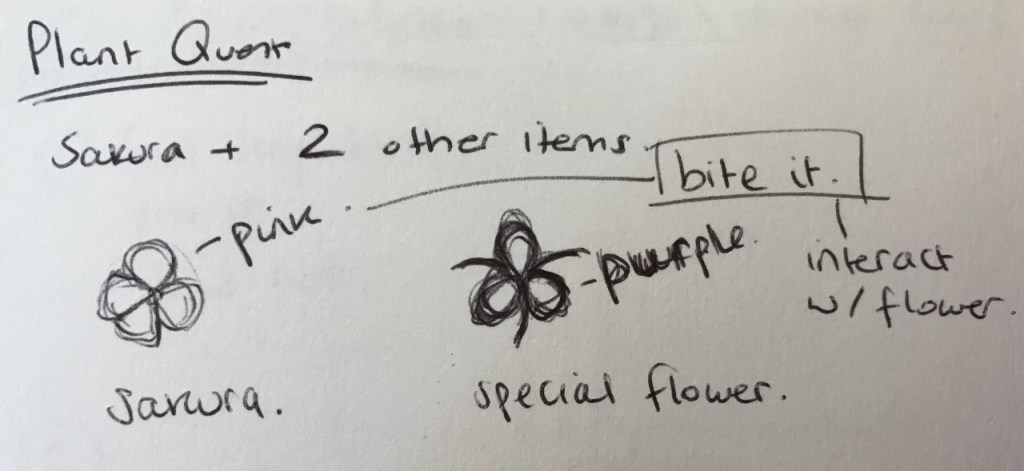The details that needed completing were the items required for making the sakura into the special flower. We decided that two items was a good number for making it complex enough to be engaging without making the quest too convoluted. We wished for the two items to do different things to the sakura to make the quest more interesting – this meant that two different things needed to be changed on the sakura. In the end, we chose colour and shape as the things that needed changing.