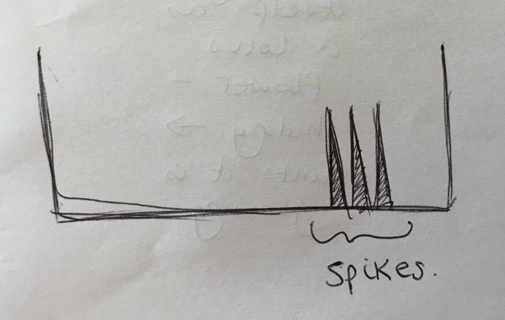 Getting three spikes – we decided to make the spikes be underground as not many of the quests so far require the player to travel underground. I proposed that the spikes be protruding from the ground – when the player is in the midst of taking one, the area will begin to crumble and break – the deer will then automatically place the spike back and let go. The player would need to replace the spikes with something else – these items need to be of a similar shape. We discussed ideas for what the items could be and ended up choosing to use sticks. However, we wanted the sticks to be harder to find than just picking them off of the ground or ramming a tree. As a result, we chose to use eroded sticks from the waterfall. Normal sticks would be found near the spikes to act as red herrings.