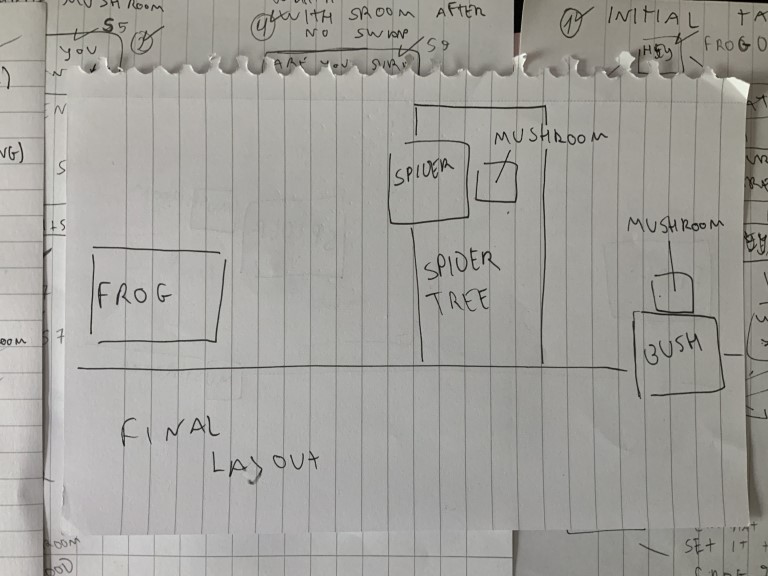 The spider could ask the player for the bad mushroom in exchange for the good mushroom – this allows the player to discover the option to kill the frog. Afterwards, the player can choose to trade the mushrooms or keep the bad one to give to the frog. We also decided to make both mushrooms appear in plain sight, otherwise the player might fail to realise that there are two mushrooms they could give the frog – they think they only need one. This meant the bad one would have to only be partially hidden whilst the good one is clearly in the web. This newly altered version of the mushroom quest was readily accepted by the group and so, was taken forward as part of the final game scope.