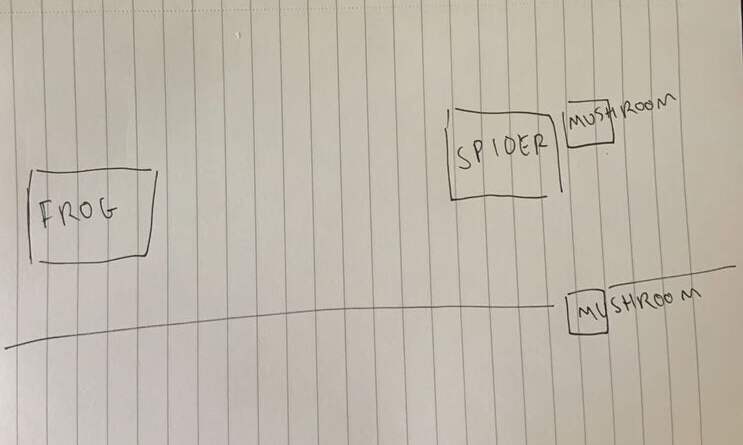 Shannon decided to still draw a quick diagram of the current scope idea for reference to go from. It consists of the frog pond, the cave and the two mushrooms in the cave. Below is the diagram.