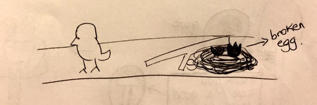However, this didn’t explain why it had been separated from its mother – surely its mother would either have taken the bird with her or the bird would have followed her when she had left. After some discussion, we decided to make the bird a baby bird that was newly hatched – it had hatched after the mother had left. This meant that the bird couldn’t have followed its mother or been taken by its mother when she left. In order to showcase this, we decided to place a broken egg in the ruined birds nest to suggest that the bird had recently hatched from it.