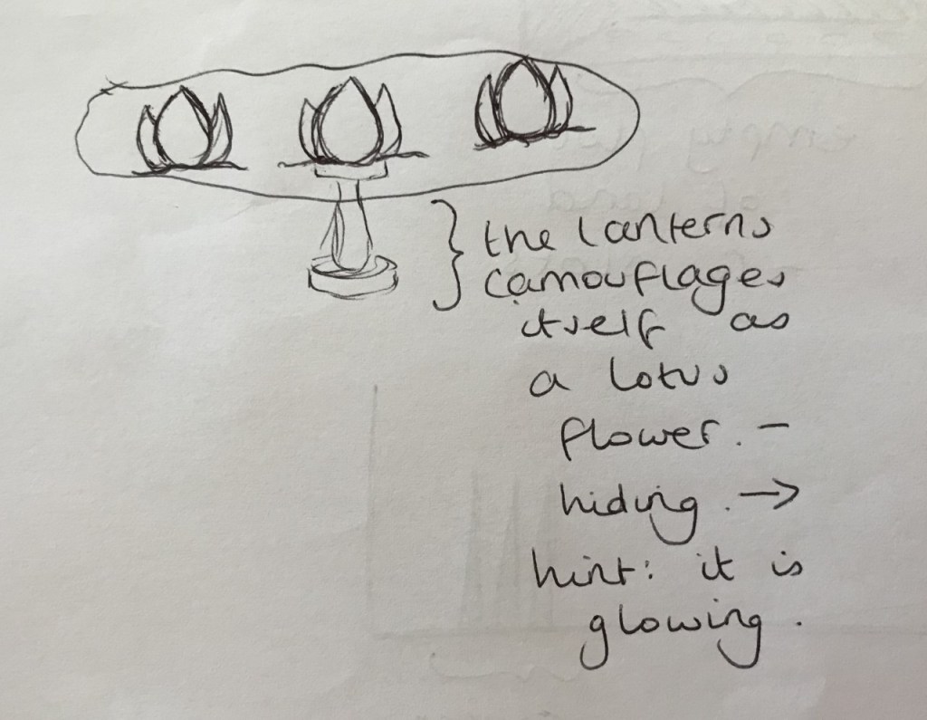 Additionally, we decided to further elaborate on the lotus lantern. We thought we could make the lantern camouflage itself in a lotus pond so that it looks like a normal lotus flower – its bottom flower is hidden underwater. As a method of implying to the player which lotus is the lantern, we could have the lantern glow periodically.